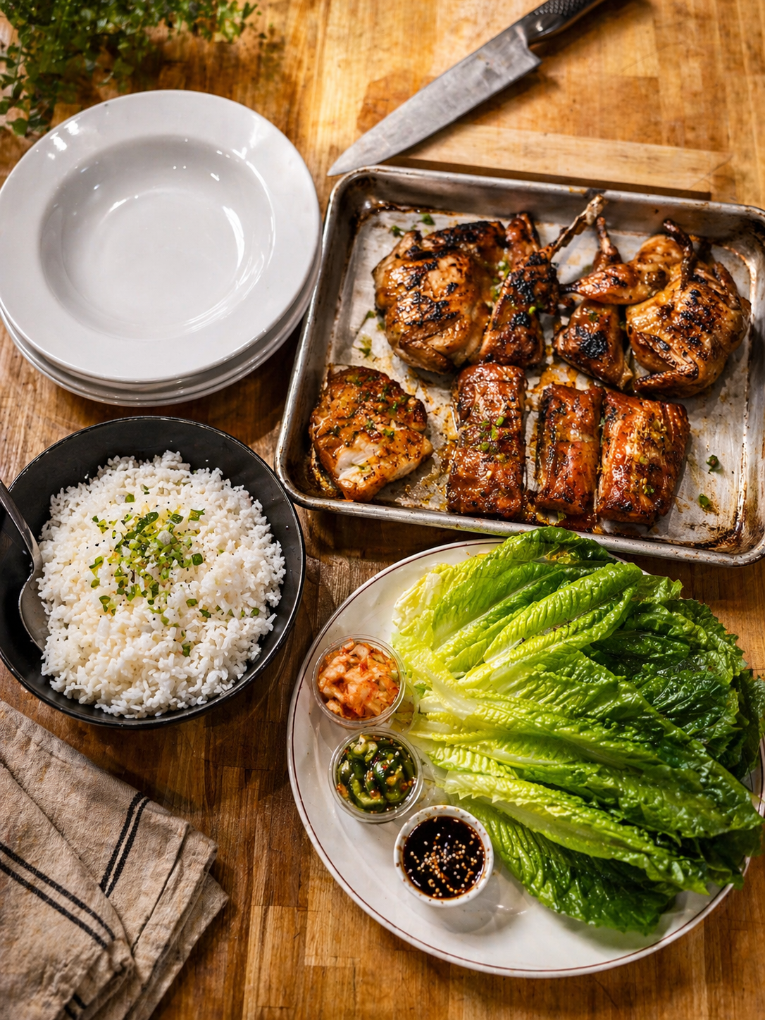 On prend une feuille, on y dépose un morceau de viande, un peu de riz, une pointe de kimchi ou de concombre⊠et on referme.