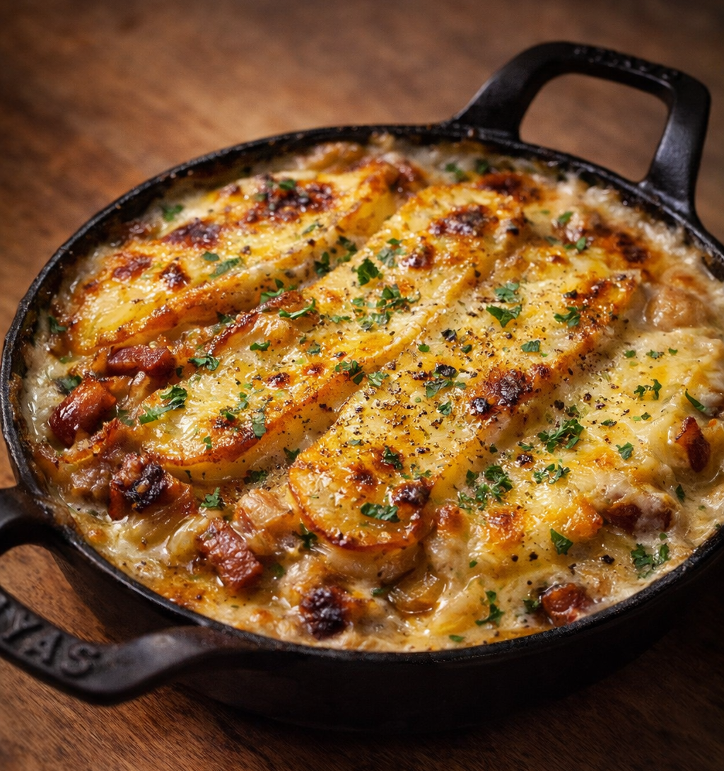 Au four, le fromage développe une croûte dorée irrésistible, pendant que les pommes de terre absorbent toutes les saveurs des lardons et du fromage. Le résultat : un plat riche, crémeux et profondément réconfortant.