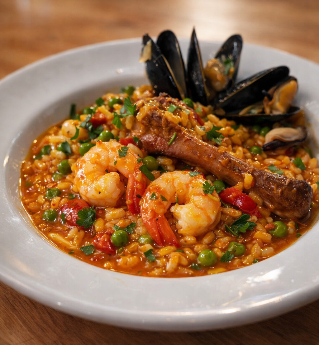 La paella de la famille Balthazar réunit riz safrané, fruits de mer et viande dans une sauce riche et parfumée. Crevettes, moules et pilon de canard se mêlent aux tomates, poivrons et petits pois dans un bouillon savoureux qui imprègne chaque grain de riz.