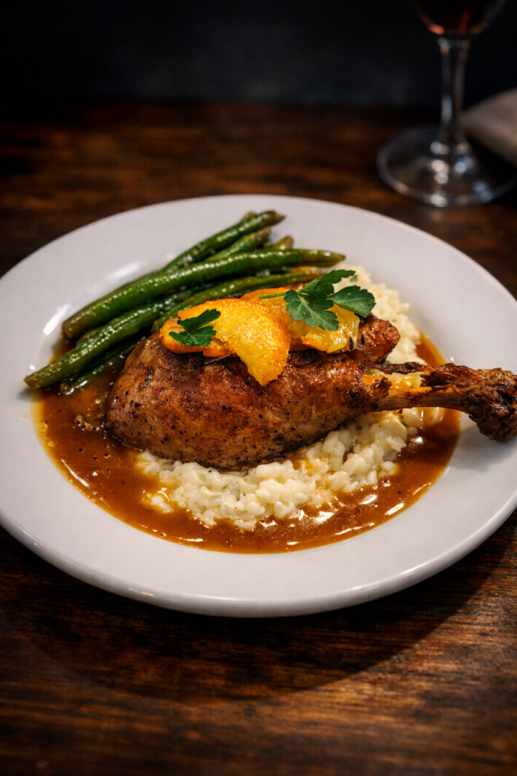 Cuisse de canard confite avec une sauce à la marmelade d’orange et au Grand Marnier.
