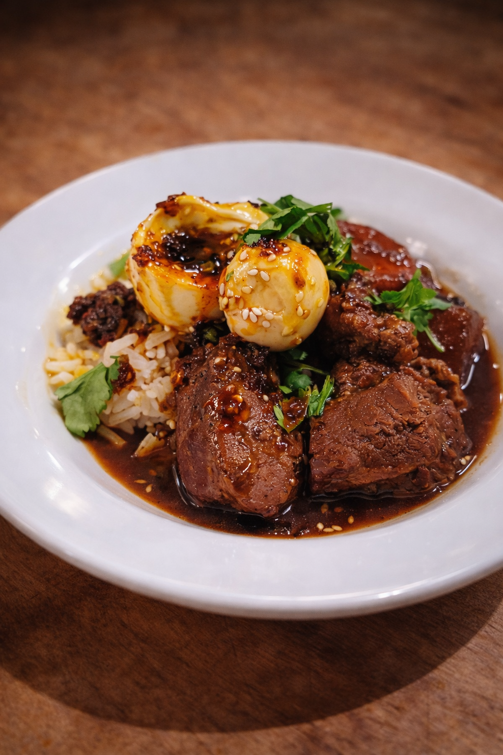 Porc fondant nappé d’un caramel salé parfumé, garni de Ớt Sa Tế maison.
